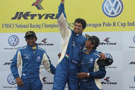 In the JK Tyre Volkswagen Polo R Cup, the first race was run in two parts for a total of eight laps following three racing incidents involving Alisha Abdullah - the only lady driver, Ajay Kini of Hyderabad and Prashanth Tharani Singh. In the first race, Mumbai's Pole starter Ameya Walavalkar won comfortably by four seconds ahead of second placed Rahil Noorani. Mihir Dhakar and JK Tyre driver Diego Duez came third and fourth respectively. In the second race, Donovan Vaz and A. Sandeep Kumar of Chennai came first and second and denied Walavalkar a deserving double. Walavalkar came third in the second race.