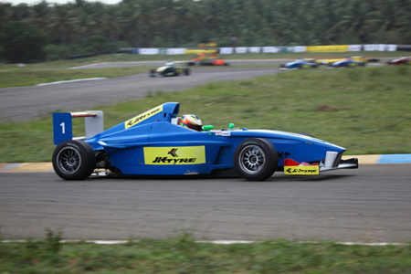 August 10, 2013, Coimbatore: Day 1 in Round 2of the 16th JK Tyre Racing Championship 2013 presented motorsport aficionados with countless moments packed with speed, thrills and excitement at the historic Kari Motor Speedway in Chettipalayam near here. While Vishnu Prasad cornered glory and took the chequered flags in the newly introduced JK Racing India Series and one race of the Formula LGB 4 class, Sarosh Hataria delighted spectators with a grand display of swiftness and excellent control.