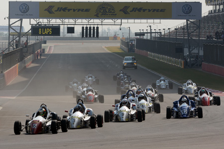 But the day came alive with JK Racing India series when the JK FB02 cars rolled on to grid. With the championship on the line between Vishnu Prasad and 15–year–old Arjun Maini set the stage for close action. Maini started from pole, but by the fourth corner at the end of the 1.2km back straight, both Prasad and Chittesh Mandody were on his gearbox. Exiting the corner Maini got sandwiched between the two chasers and had to back off. Seizing the opportunity, Mandody snatched the lead and started pulling away. In the meantime, Prasad started slipstreaming in Mani’s tow which helped him to pull off a sling–shot maneuver to nose ahead. The top three crossed the finish line with Mandody leading Prasad and Maini.