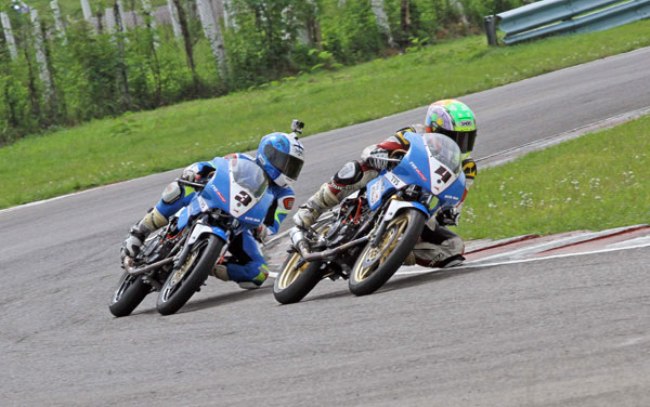 Image-1: Jagan Kumar (No.3) slips past his TVS Racing team-mate Harry Sylvester on way to winning the Group B (165cc) Open race in the third round of the MMSC FMSCI Indian National Racing Championship in Chennai on Saturday.
